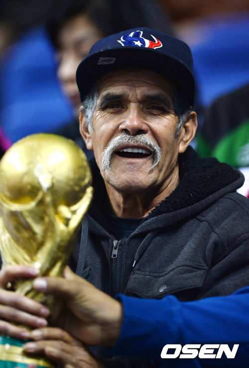 경기에 앞서 멕시코 응원단이 모형 월드컵을 손에 쥐고 열띤 응원을 하고 있다.