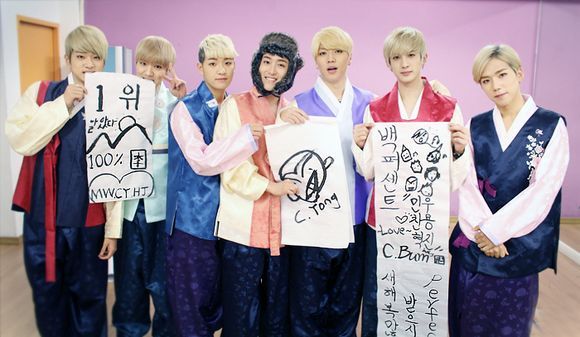 공개된 사진 속에서 백퍼센트는 고운 한복 차림으로 직접 쓴 붓글씨 종이를 들고 각양각색의 다양한 표정을 짓고 있다.