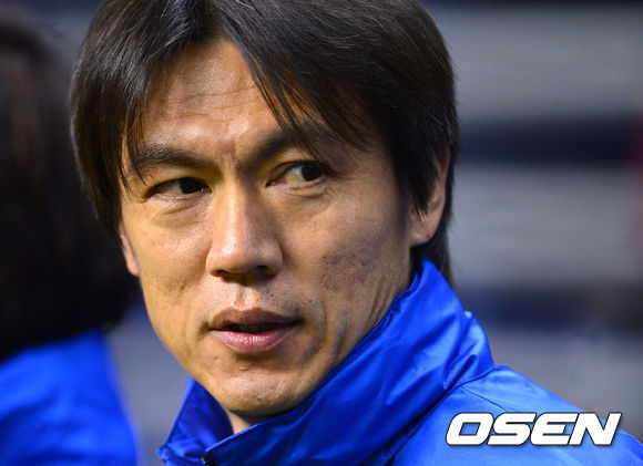 경기에 앞서 한국 홍명보 감독이 선수들을 바라보고 있다.