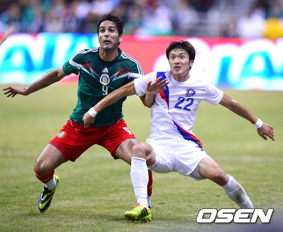 후반 한국 박종우가 멕시코 니그리스와 몸싸움을 하고 있다.