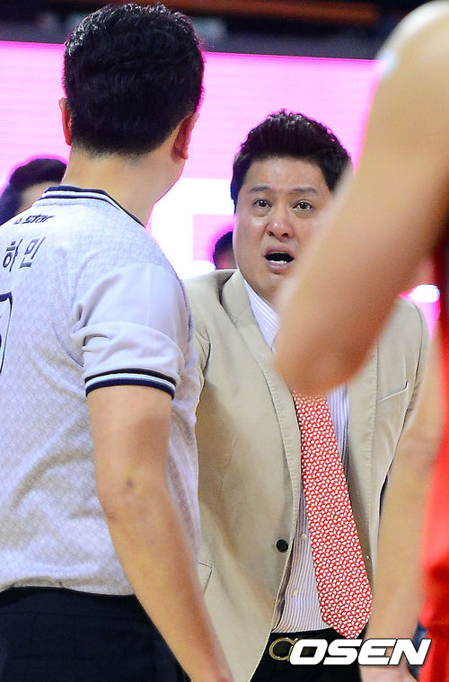 2쿼터 SK 문경은 감독이 주심의 판정에 항의하고 있다.