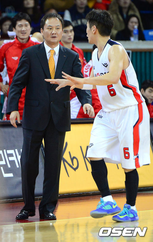 2쿼터 모비스 유재학 감독과 양동근이 이야기를 나누고 있다.