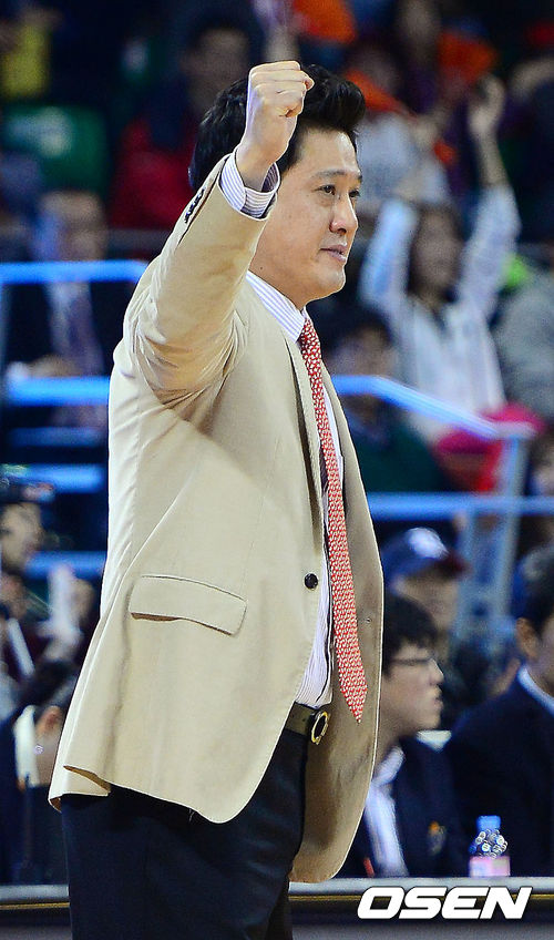 3쿼터 SK 문경은 감독이 역전에 기뻐하고 있다.