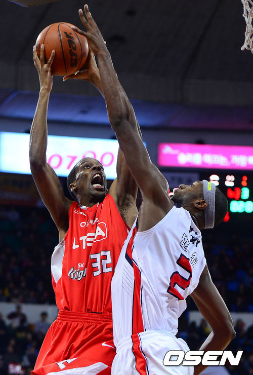 4쿼터 SK 헤인즈가 골밑슛을 시도하고 있다.