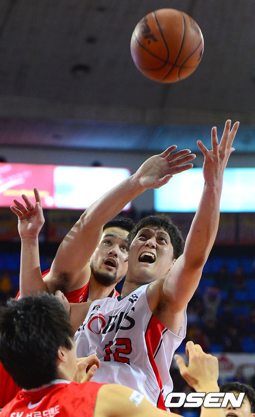 4쿼터 모비스 함지훈과 SK 김민수가 리바운드 다툼을 벌이고 있다.