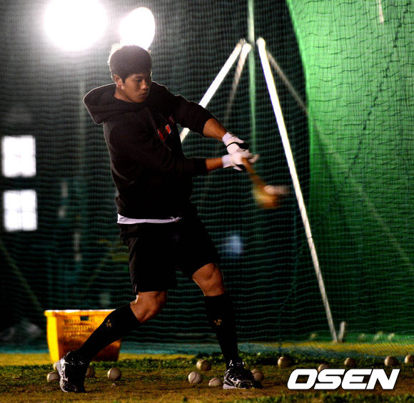 30일 오후 일본 오키나와 서든 비치 호텔 야외 훈련장에서 정범모가 타격 훈련을 하고 있다.
