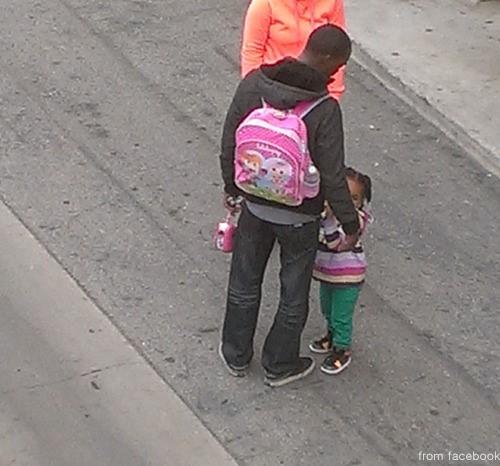 사진 속에는 아빠와 딸로 보이는 흑인 부녀가 등장하는데, 아빠가 딸의 가방이 분명한 연분홍의 가방을 등에 메고, 비슷한 연분홍의 손가방 까지 들고 있는 모습이 담겨 있다.