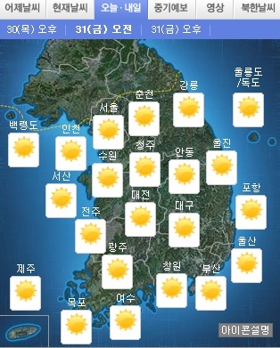 31일 전날 내렸던 비는 밤사이 모두 물러가고, 하늘은 맑아지겠으나, 기온이 영하권으로 떨어져 바깥 활동하기에 추울 것으로 보인다.