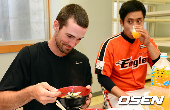 31일 오전 일본 오키나와 고친다구장에서 클레이가 떡국을 맛보고 있다.