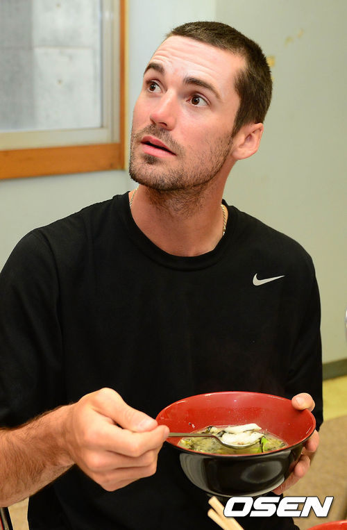 31일 오전 일본 오키나와 고친다구장에서 클레이가 떡국을 맛보고 있다.
