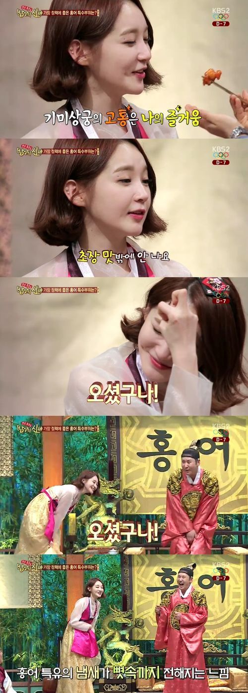 이날 대게, 돼지고기에 이어 정력에 좋은 음식으로 홍어가 소개됐다. 여신팀은 다섯 가지 홍어의 특수부위를 시식했다.
