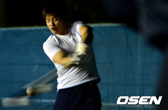 야간 자율 훈련에 나선 민병헌이 타격 연습을 하고 있다./dreamer@osen.co.kr