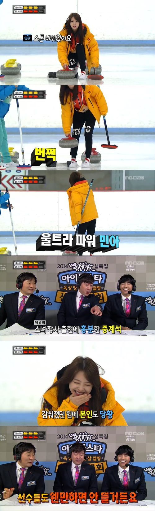 이날 걸스데이가 앞서있는 가운데 민아가 컬링 스톤을 밀기 위해 준비하고 있었다. 그러나 노란색 스톤을 밀어야 하는 민아는 달샤벳의 스톤을 밀려고 했고 이를 심판이 지적했다.