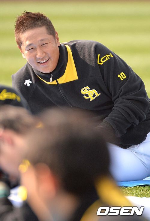 1일(현지시간) 오전 일본 소프트뱅크로 이적한 '빅보이' 이대호가 일본 미야자키 이키메노모리 운동공원에서 열린 팀 스프링캠프에 참가해 스트레칭을 하며 환하게 미소짓고 있다.