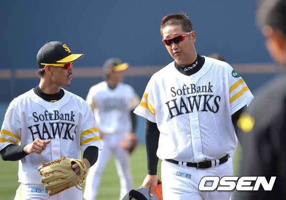 1일(현지시간) 오전 일본 소프트뱅크로 이적한 '빅보이' 이대호가 일본 미야자키 이키메노모리 운동공원에서 열린 스프링캠프에 참가해 동료들과 이야기 하며 발걸음을 옮기고 있다.