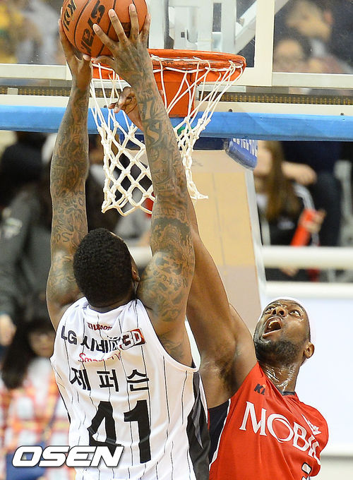4쿼터, 모비스 벤슨이 LG 제퍼슨에게 파울을 범하고 있다.