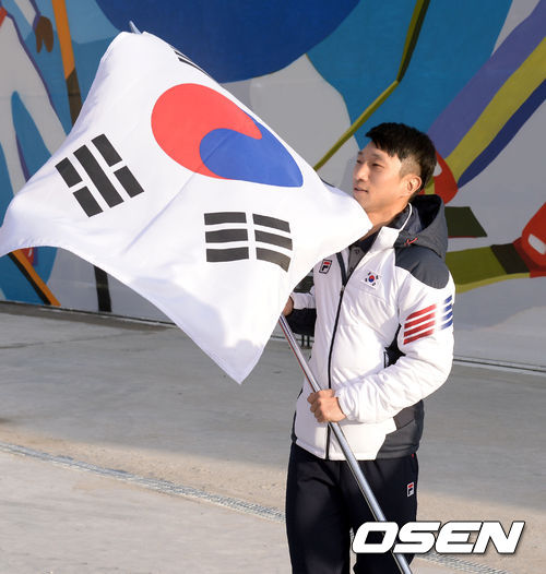선수단 기수 이규혁이 태극기를 들고 포즈를 취하고 있다.