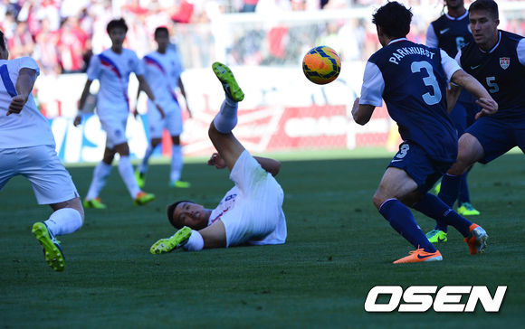2일 오전(한국시간) 미국 캘리포니아 주 카슨의 스텁 허브센터에서 열린 한국과 미국의 평가전에서 전반 한국 김신욱이 넘어지고 있다.