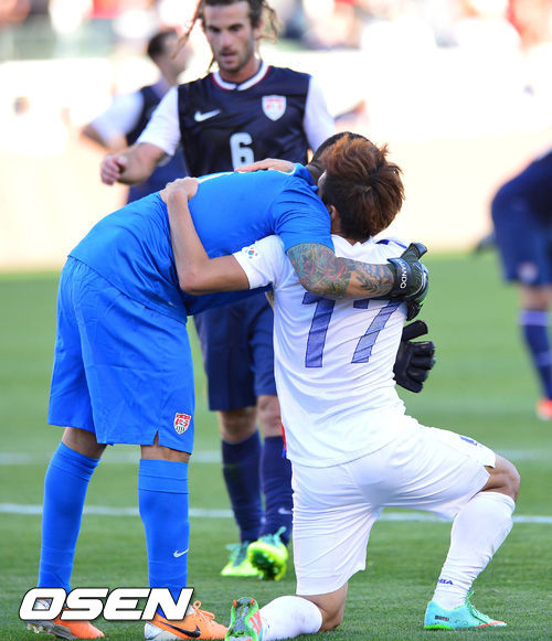 경기를 마치고 한국 고요한이 미국 닉 리만도 골키퍼와 포옹을 하고 있다. /spjj@osen.co.kr