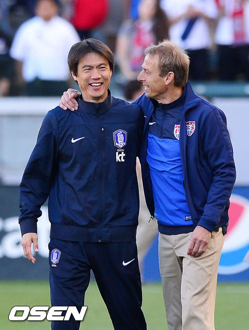 경기를 마치고 한국 홍명보 감독과 미국 위르겐 클린스만 감독이 어깨 동무를 하며 얘기를 나누고 있다. /spjj@osen.co.kr