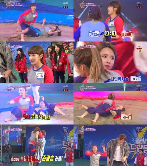 이날 크레용팝 멤버들은 장신의 나인뮤지스 멤버들과 씨름 대결을 펼치게 됐다. "작은 고추가 맵다"며 10cm 이상 차이나는 키에도 지지않는 기세를 보여준 크레용팝 멤버 소율과 금미는 각각 나인뮤지스 성아와 혜미를 뛰어난 실력으로 이겨냈다.