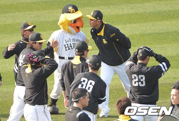2일 오전 일본 소프트뱅크로 이적한 '빅보이' 이대호가 일본 미야자키 이키메노모리 운동공원에서 열린 스프링캠프에 참가해 스트레칭 훈련을 마치고 팀 마스코트와 장난을 치고 있다.