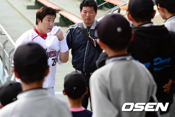 2일 오후 일본 오키나와 킨구장에서 KIA의 전지 훈련이 진행된 가운데, 나지완이 훈련에 참관 온 성동초등학교 야구부원들을 만나고 있다.