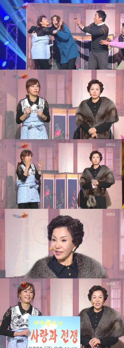 ‘개그콘서트’가 드라마 ‘사랑과 전쟁’을 패러디했다. 여기에 ‘사랑과 전쟁’ 속 막장 시어머니 전문 배우 서권순과 이혼 전문 배우 이시은이 특별 출연, '사랑과 전쟁'을 통해 보여준 자신들의 모습을 각각 패러디해 웃음을 자아냈다.
