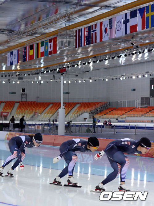 러시아 2014소치 동계올림픽 개막을 앞둔 3일(한국시간) 오전 러시아 소치 해안클러스터 내 아들레르 아레나에서 스피드스케이팅 대표팀이 첫 훈련을 하고 있다.