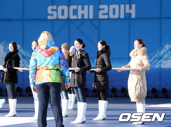 러시아 2014소치 동계올림픽 개막을 앞둔 3일(한국시간) 오전 러시아 소치 해안클러스터 내 올림픽파크 야외무대에서 올림픽 도우미들이 시상식 예행 연습을 하고 있다