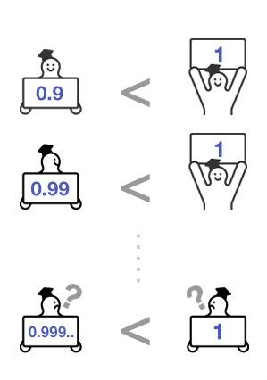 최근 한 포털사이트에 ‘0.999…와 1의 차이는 무엇일까?’라는 게시물이 올라와 네티즌들의 관심을 얻고 있다. 0.999…이란 소수점에서 9가 무한히 반복되어 계속 붙는 상태를 말한다. 아무리 9가 반복되더라도 1보다는 작은 것일까? 아니면 1과 같은 것일까.