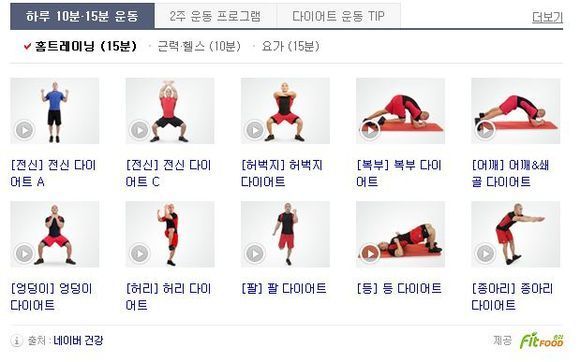 '하루 15분 다이어트' 영상을 보면 트레이너가 전신, 복부, 허벅지, 하체 등 신체 각 부분의 다이어트 동작을 선보인다.