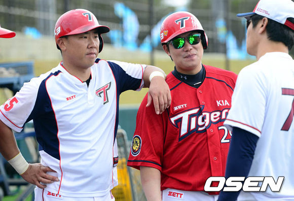 3일 오후 일본 오키나와 킨구장에서 이범호, 나지완이 김종국 코치에게 훈련 내용을 듣고 있다.