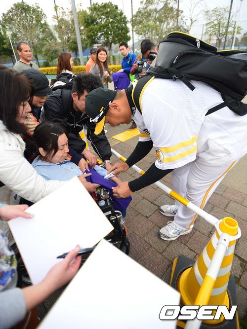 훈련을 마친 이대호가 버스로 향하며 기다리던 팬들에게 사인을 해주고 있다.