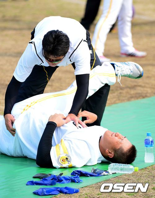 훈련을 마친 이대호가 스트레칭을 받고 있다.