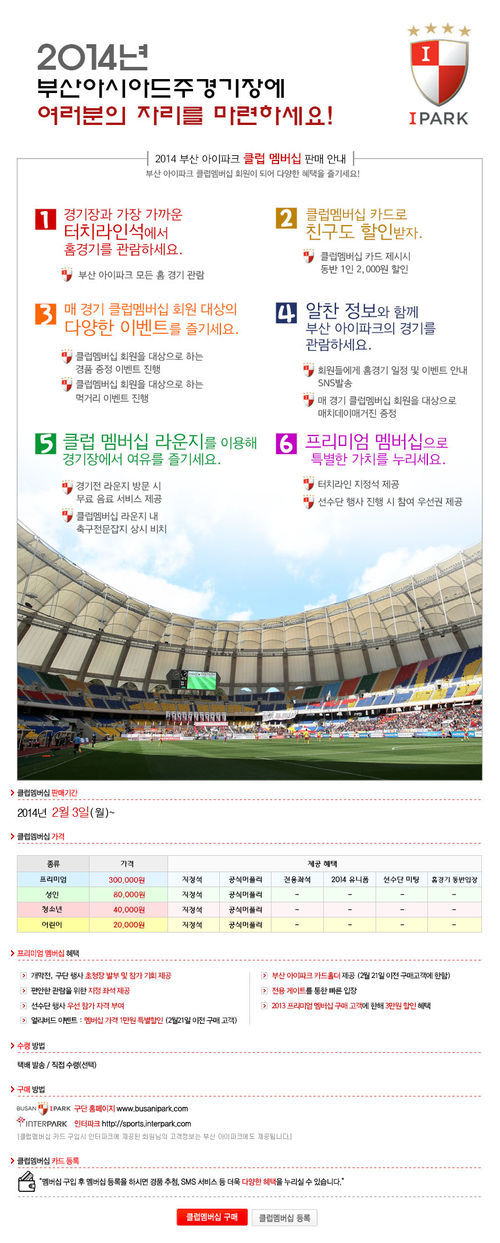 부산 아이파크의 2014 시즌권은 부산 아이파크 홈페이지 www.busanipark.com 과 sports.interpark.com 에서 구매 가능하며 구입 관련 문의는 페이스북(facebook.com/bsipark)과 트위터(@buasniparkfc)를 통해 가능하다.