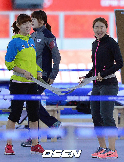 러시아 2014소치 동계올림픽 개막을 앞둔 3일(한국시간) 러시아 소치 해안클러스터 내 아들레르 아레나 경기장에서 이상화가 동료들과 몸을 풀고 있다.