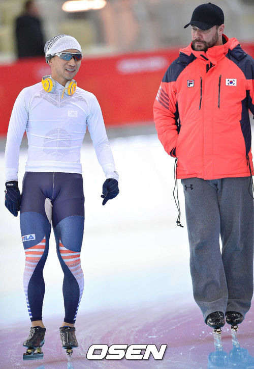 러시아 2014소치 동계올림픽 개막을 앞둔 3일(한국시간) 러시아 소치 해안클러스터 내 아들레르 아레나 경기장에서 대표팀 스피드스케이팅 케빈크로켓 코치와 이규혁 선수가 이야기를 나누고 있다.