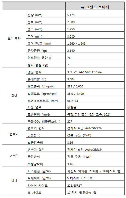 이번에 출시된 7인승 럭셔리 미니밴 뉴 그랜드 보이저는 2014년형 모델로 특히 업무상 출장 등 이동이 잦은 비즈니스맨들이 이동 중 휴식을 취하거나 업무를 계속할 수 있는 환경을 구현한 공간 배치가 두드러진다. 고급스러운 실내 인테리어와 플립 트레이 테이블, 동급 유일 블루레이(Blue-RayTM) 플레이어 및 9인치 듀얼 LCD 스크린 등 2, 3열 편의장치를 업그레이드해 비즈니스 VIP를 위한 업무 및 의전 차량으로의 활용성을 높였다.