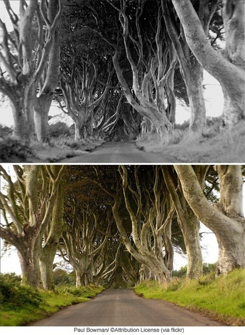 이 곳은 아일랜드 북부 앤트림 카운티 부근에 있는 ‘다크 헤지스’라는 이름의 숲길로 알려졌으며 18세기 스튜어트가가 너무밤나무를 심어 저택으로 이르는 길을 꾸몄는데, 수백년이 지난 지금 신비한 분위기의 숲길이 되었다고 전해졌다.