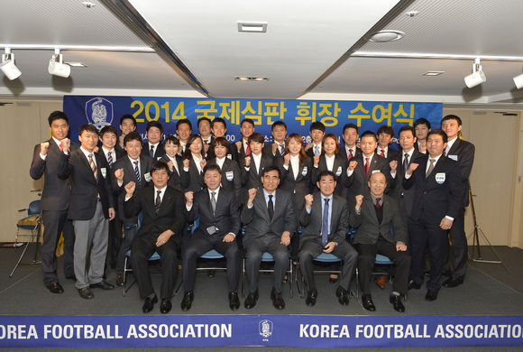 대한축구협회(회장 정몽규)는 4일 오전 신문로 축구회관 2층 다목적회의실에서 ‘2014년도 국제심판 휘장수여식’을 개최했다. 이번 휘장수여식에서 국제심판 휘장을 받은 심판은 총 26명으로 남자 주심 7명, 남자 부심 9명, 여자 주심 3명, 여자 부심 4명, 풋살 심판 3명이다.