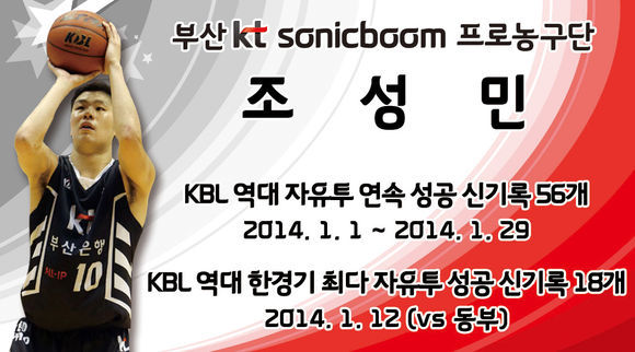 한편 이날 홈 경기는 '아디다스 데이'로 정하고, KT 공식 후원사인 글로벌 리딩 스포츠 브랜드 아디다스와 다양한 이벤트로 아디다스 대표이사(지온 암스트롱)가 조성민에게 신기록 수립을 축하하는 의미로 200만 원 상당의 아디다스 상품권을 수여할 예정이다.