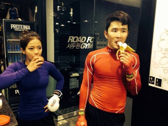 사진 속 송가연은 남색 계열의 운동복을 입고 왼쪽 손을 허리에 단 채 사과를 먹고 있다. 또 그의 옆에는 개그맨 출신으로 종합격투기 선수 도전을 앞두고 있는 윤형빈이 자리잡고 있다. 그는 바나나를 섭취 중이다.