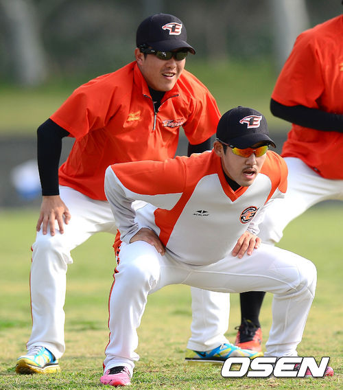 4일 오전 일본 오키나와 고친다구장에서 정근우와 이용규가 몸을 풀고 있다.