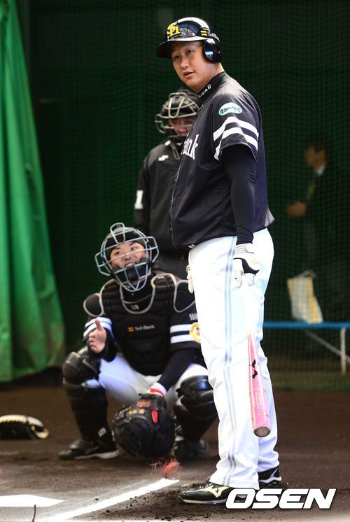 이대호가 투수들의 불펜 투구 연습 중 타석에 들어서 공을 지켜보고 있다.