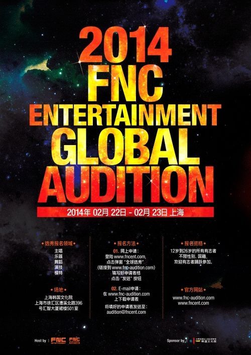 FNC는 오는 22일~23일 양일간 중국 상하이에서 첫 번째 글로벌 오디션을 열고 글로벌 인재 발굴에 나선다. 홈페이지와 SNS 등을 통해서 영문-중문 안내문을 업로드 했으며, 한류스타를 꿈꾸는 대륙의 인재들을 맞을 준비를 마쳤다.