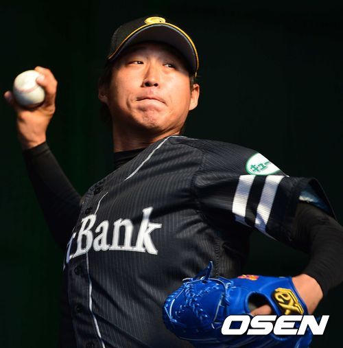 소프트뱅크 한국인 투수 김무영이 불펜 투구를 펼치고 있다.