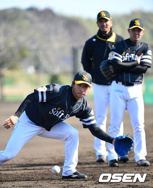 소프트뱅크 한국인 투수 김무영이 수비 연습을 진행하고 있다.