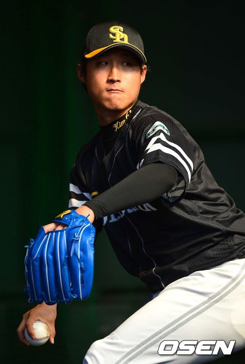 소프트뱅크 한국인 투수 김무영이 불펜 투구를 펼치고 있다.