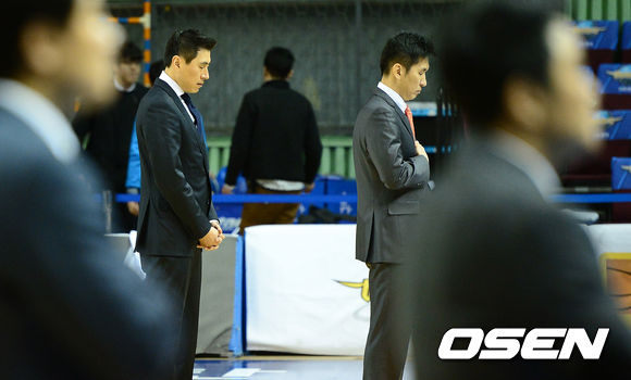 경기에 앞서 삼성 이상민 코치와 김상식 감독대행이 국민의례를 하고 있다.